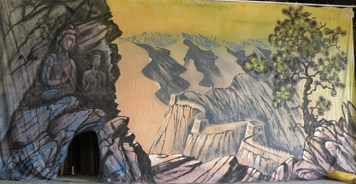 Thoroughly Theatre Stage Cloths & Props. Our Great Wall And Cave Calico Theatre Backcloth is commonly used for scenes & shows such as Great Wall Of China, Hills, oriental, cave, Mountains, Aladdin, Outside Cave, Pantomime, It’s 34ft 7in wide by 17ft 6in high and made from Calico.