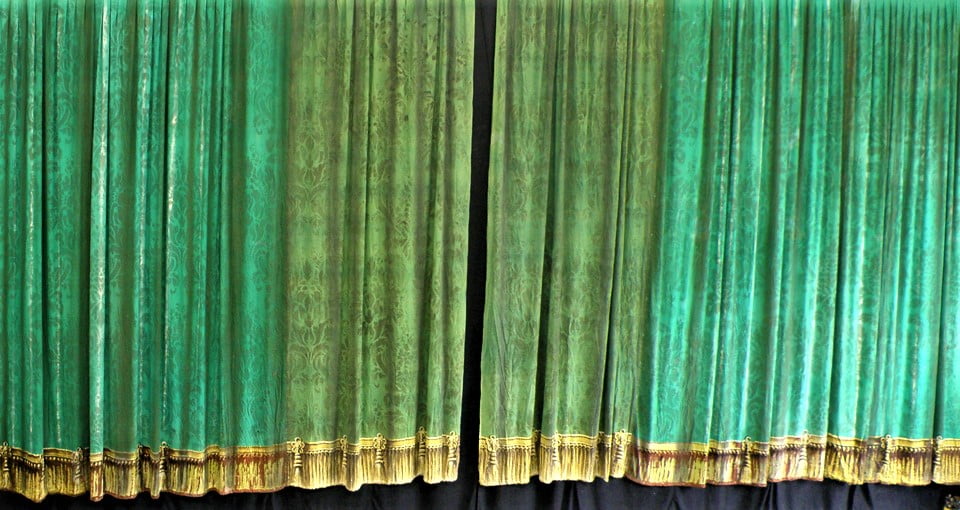 Description : green, curtains, gold trim