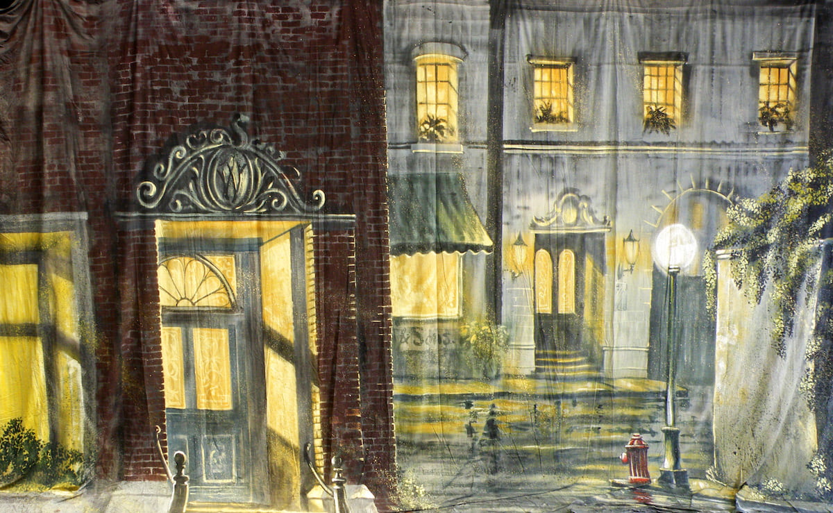 Thoroughly Theatre Stage Cloths & Props. Our Hollywood Street Calico Theatre Backcloth is commonly used for scenes & shows such as Street, night, Hollywood, Singing In The Rain, alley, city, town It’s 39ft 0in wide by 20ft 0in high and made from Calico.