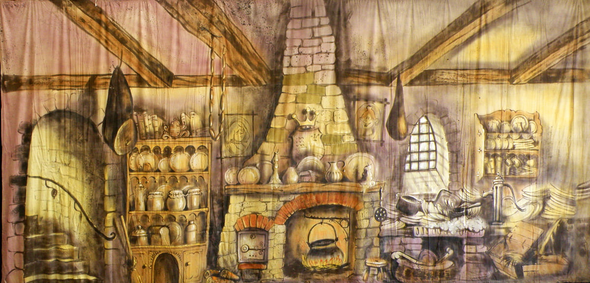 Thoroughly Theatre Stage Cloths & Props. Our Kitchen Calico Theatre Backcloth is commonly used for scenes & shows such as Kitchen, castle, Stove, Cinderella, Oven, Pots And Pans, Cooking, Pantomime, It’s 34ft 7in wide by 17ft 8in high and made from Calico.