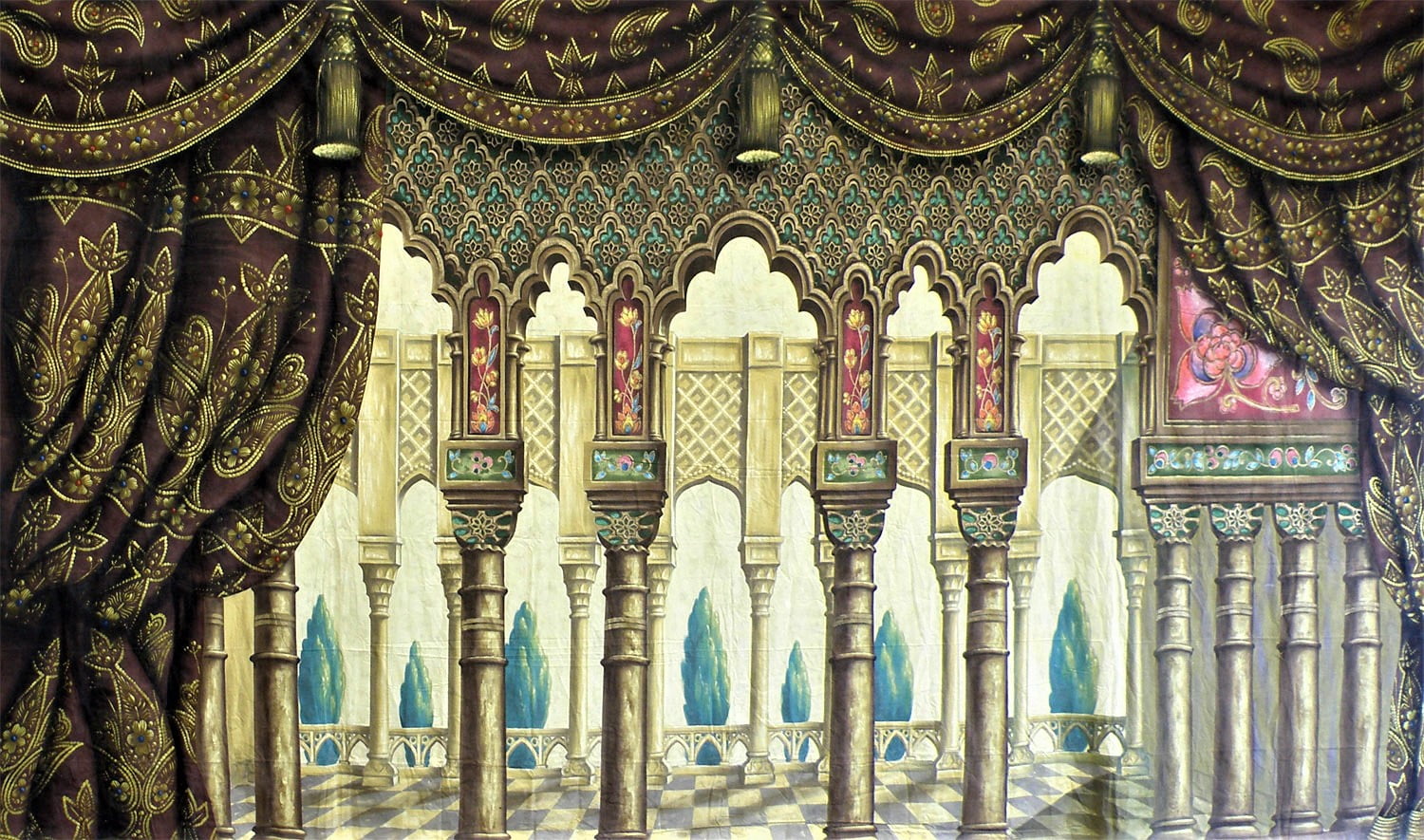 Thoroughly Theatre Stage Cloths & Props. Our Palace Courtyard Sultan Cloth 531 in used in many different productions