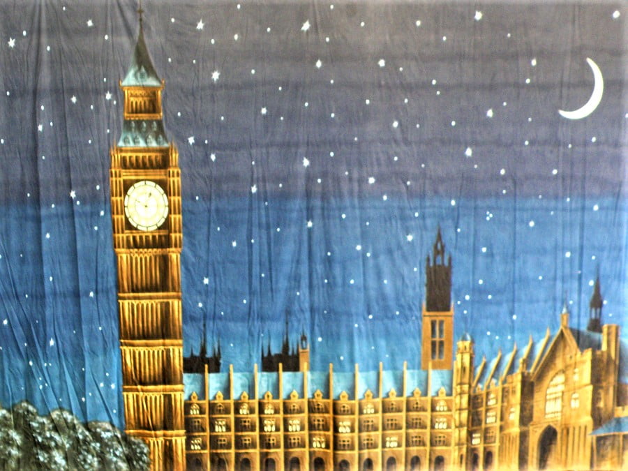 Thoroughly Theatre Stage Cloths & Props. Our Parliament Calico Theatre Backcloth is commonly used for scenes & shows such as Big Ben, London, Night, City, Clock, Tower It’s 38ft 2in wide by 17ft 7in high and made from Calico.