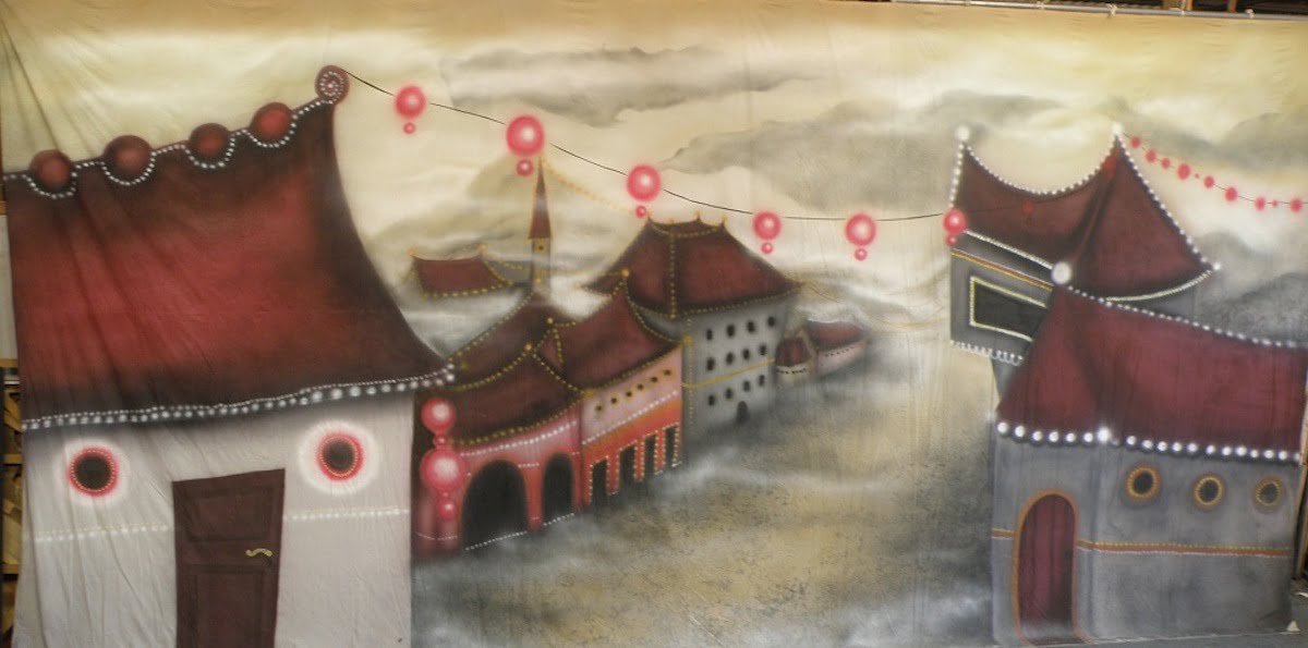 Thoroughly Theatre Stage Cloths & Props. Our Peking Street Canvas Theatre Backcloth is commonly used for scenes & shows such as Street, Pekin, Buildings, Aladdin , Pantomime’s 36ft 0in wide by 18ft 0in high and made from Canvas.